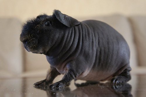 小时候皱巴巴的,长大后像一只猪!豚鼠通常是毛茸茸的,这种是变异来的稀有品种,皮肤油亮,近年受到00后喜爱。长相丑萌,温驯易养,素食主义者,但要注意它们还是一样胆小噢!