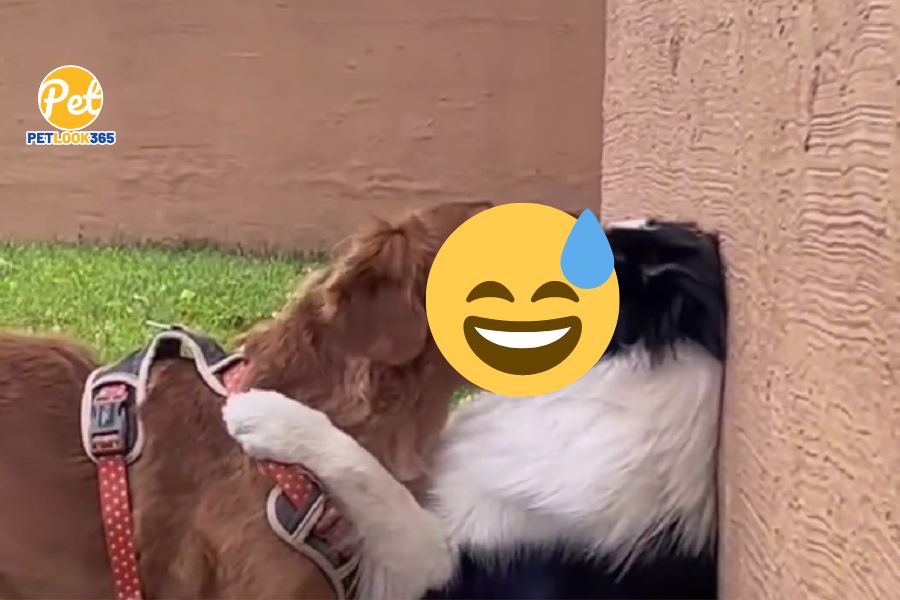 影片中,阿金霸气地压着边牧在墙上,并张开嘴含住对方的口鼻,似乎想要亲个大嘴巴。虽然它的动作轻柔,彷彿在开玩笑,但这样近距离的接触却让边牧感到害怕,完全不敢回应,很快就扭头跑掉了。